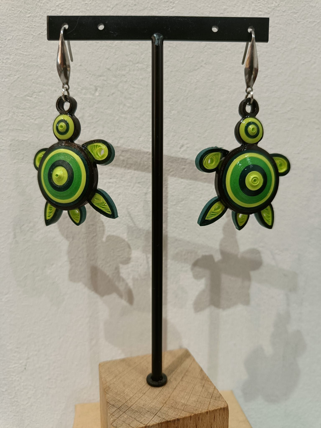 Ces boucles d’oreilles artisanales en forme de tortue sont réalisées entièrement à la main grâce à la technique du quilling, un art délicat qui consiste à rouler le papier pour créer des formes uniques et détaillées.